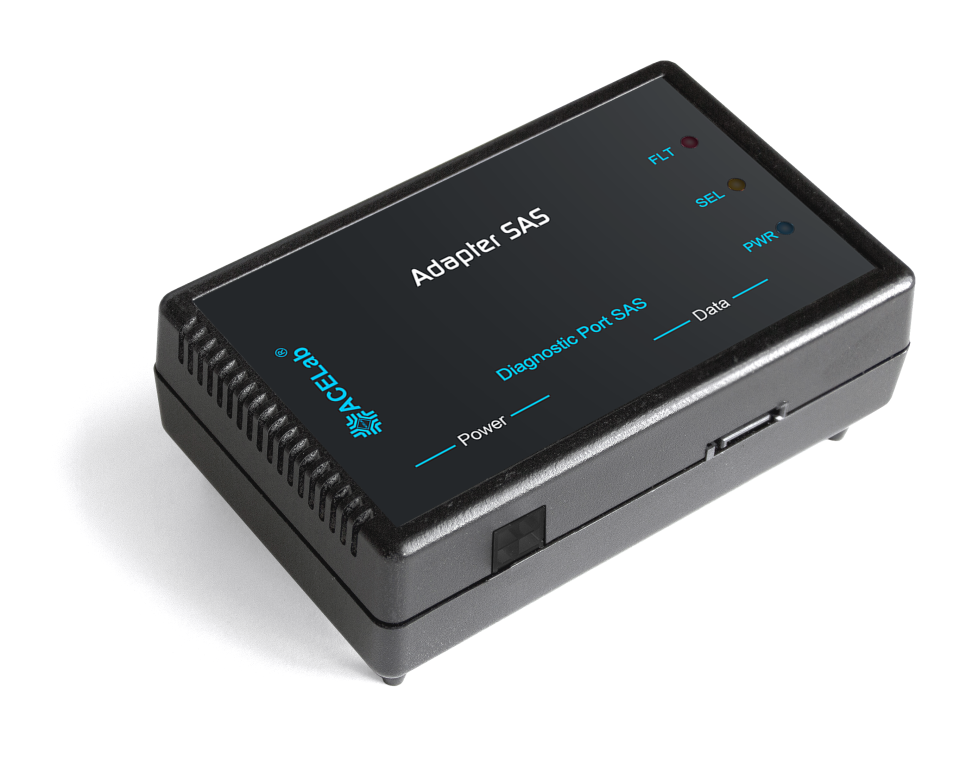 The SAS adapter is an external device which is connected to Port0 of the PC-3000 Portable III.  The adapter includes a highly productive Marvell controller, effective low-noise voltage stabilizers as well as other electronic components such as the Power and Data ports for SAS drive connection, and three LED indicators: of the provided power supply - PWR, of the drive activity - SEL, and of the error - FLT.